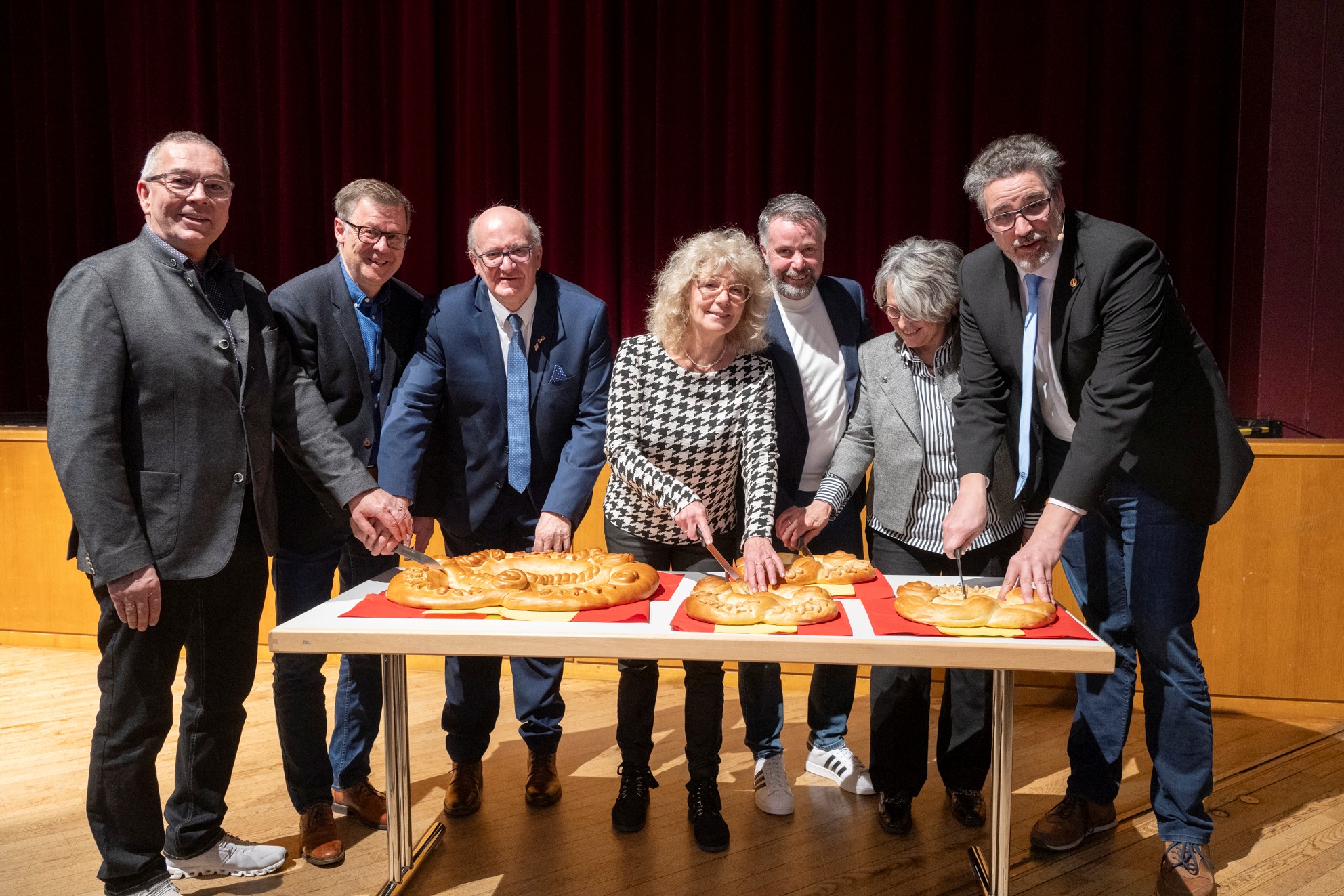 Der Männergesangverein Neuenburg präsentierte nach zwei Gesangseinlagen seinen Aufruf zu einem gemischten Projektchor, der langfristig in einen gemeinsamen Verein münden soll. Dazu sind vor allen singbegeisterte Damen aufgerufen. Am Ende des offiziellen Teils schnitten Bürgermeister Jens Fondy-Langela gemeinsam mit seinen Stellvertretern, den Ortsvorstehern aus Grißheim und Steinenstadt wie auch eines Repräsentanten des Ortsteile Zienken und der Bürgermeister von Bantzenheim die Neujahrsbrezeln offiziell an.