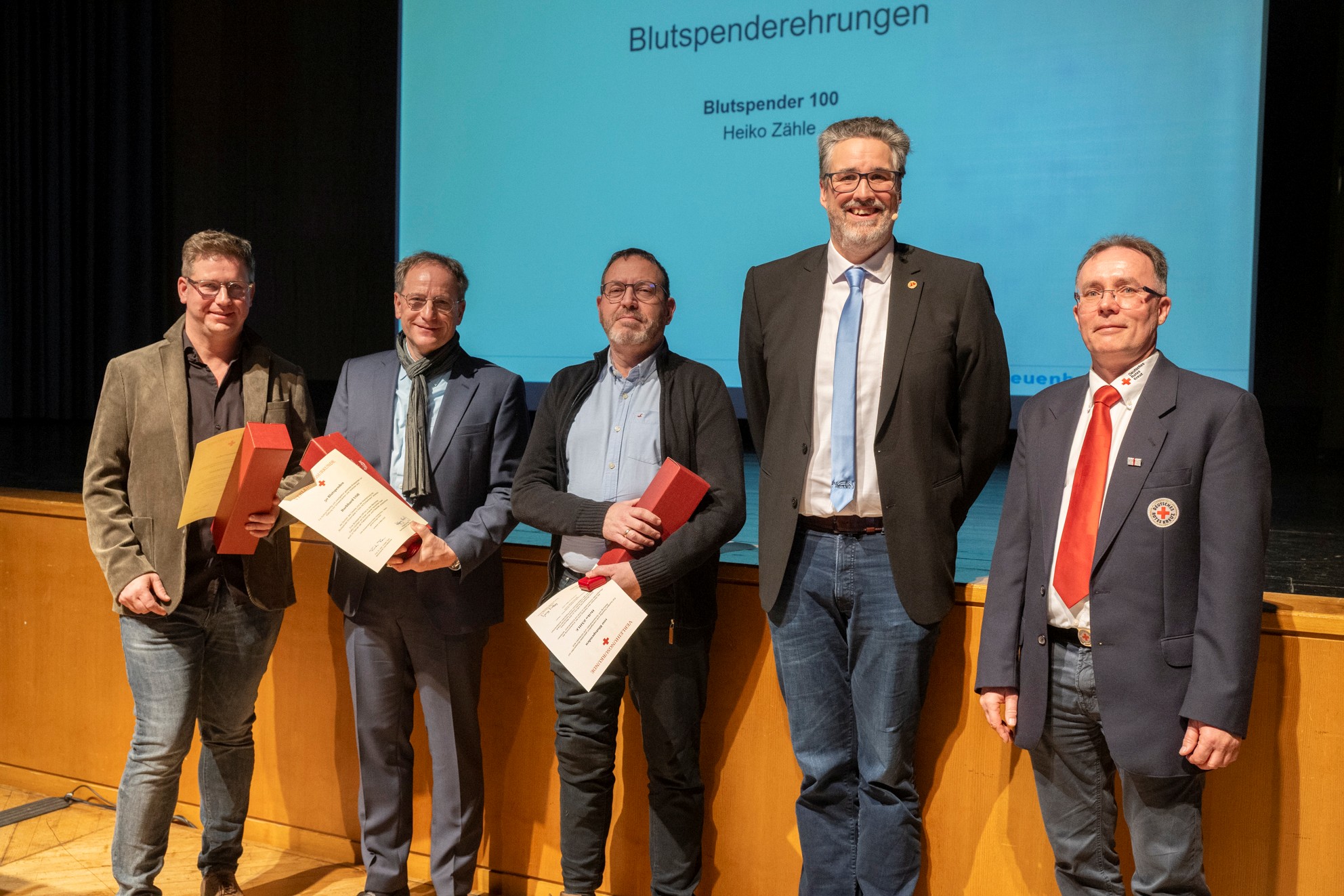 Die goldene Ehrennadel des DRK-Blutspendedienstes mit Eichenlaub und eingravierter Spenderzahl erhielten für 50 Spenden Sven Kunstmann und Burkhard Voß. Der dritte zu Ehrende, Olaf Braun, war nicht anwesend wurde aber genannt. Für 100 Spenden wurde Heiko Zähle mit der entsprechenden Ehrennadel ausgezeichnet.