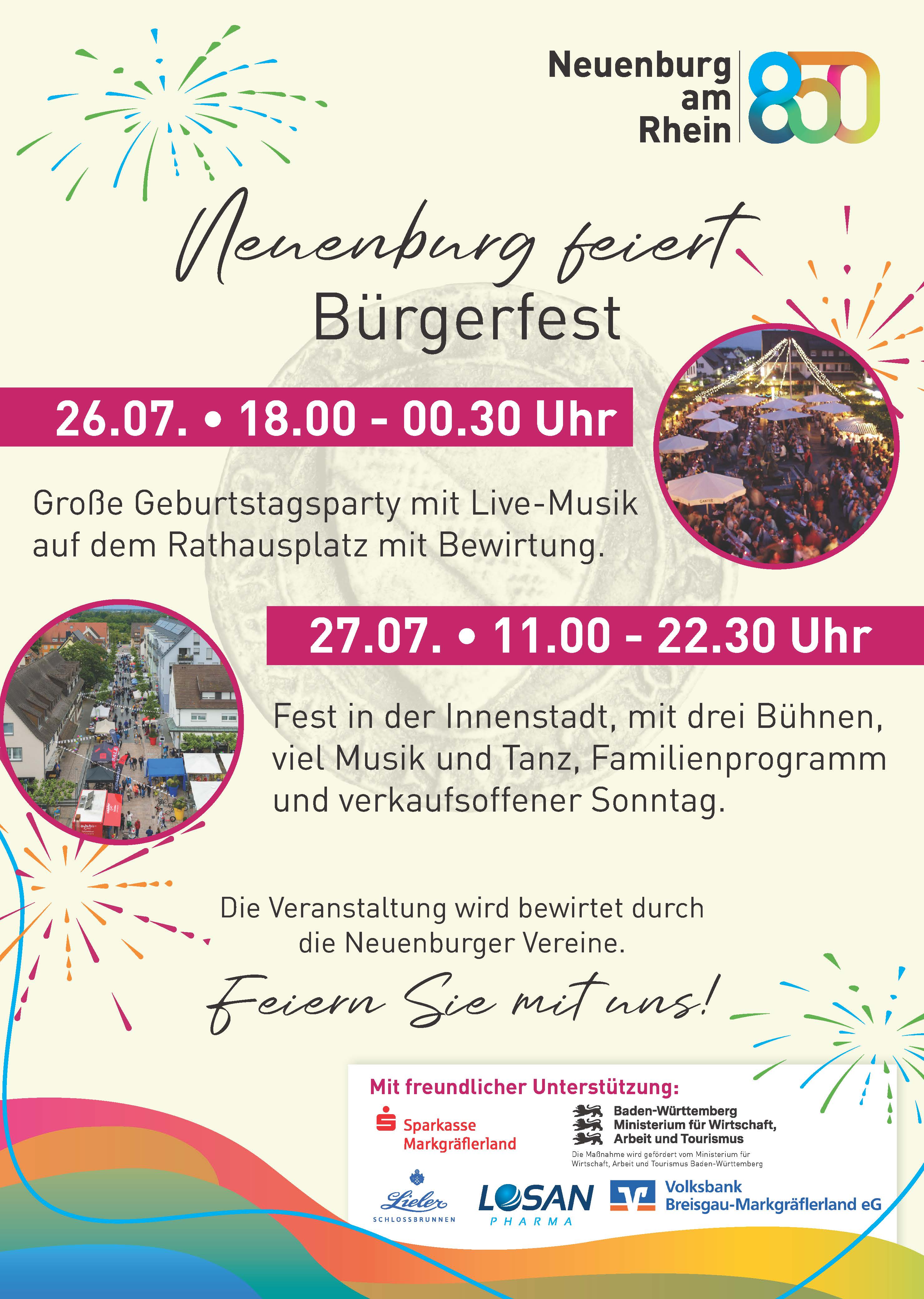 Die Stadt Neuenburg am Rhein feiert in diesem Jahr ihren 850. Geburtstag. Mit dem Bürgerfest am Wochenende, 26. und 27. Juli, in der Neuenburger Innenstadt steht der nächste Höhepunkt im Jubiläumskalender an. Die Geburtstagsparty wird ein Fest von Neuenburgern für Neuenburger sein – ganz unter dem Motto „Neuenburg feiert!“.
