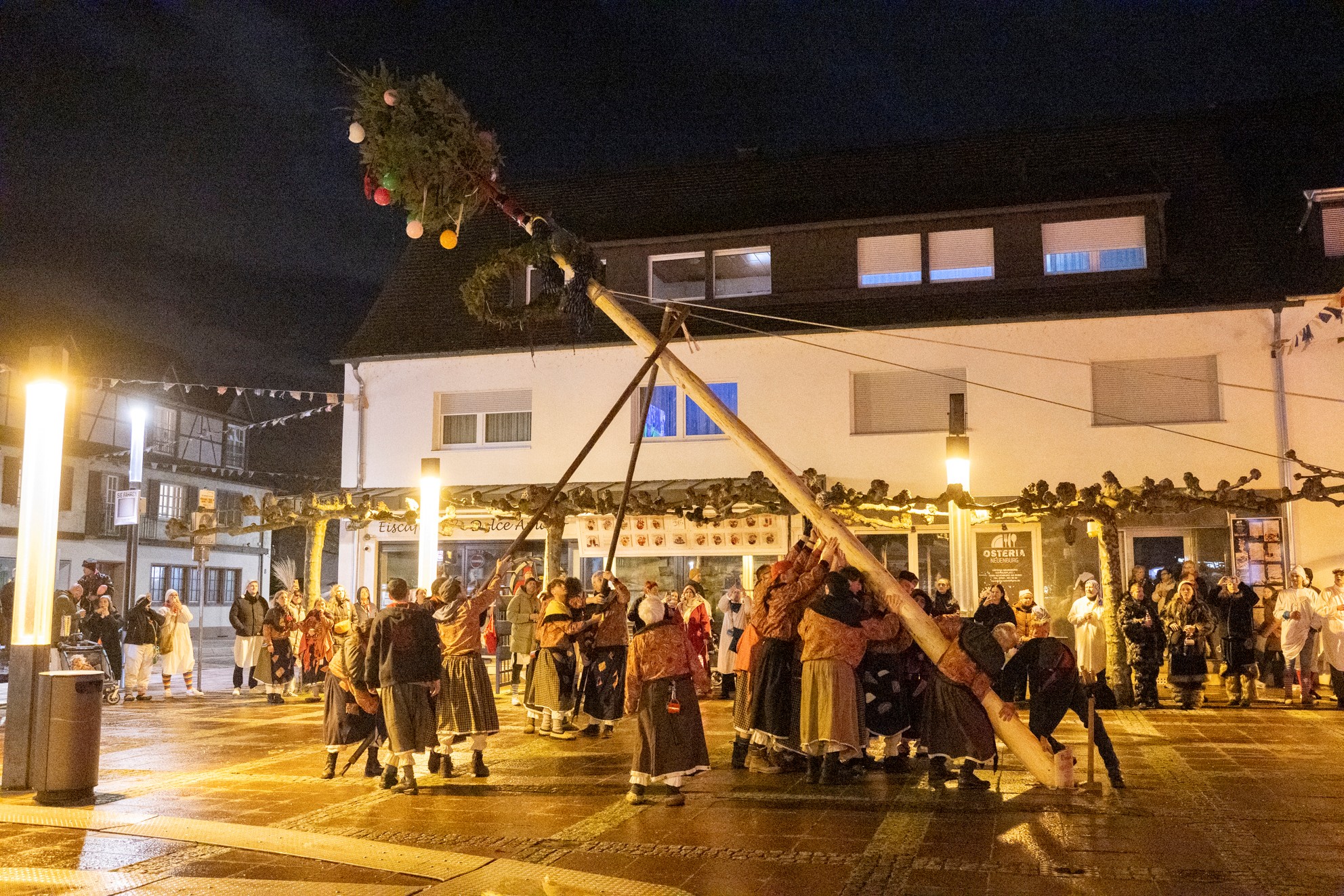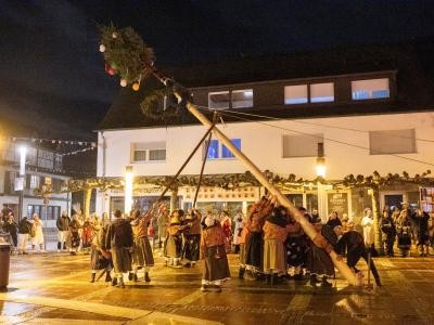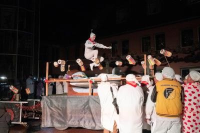 Dann traten die Burghexen in Aktion. Im Schein einiger Pyro-Fackeln stemmten sie den Narrenaum in die Höhe und ließen ihn in die vorgesehene Verankerung gleiten – natürlich erneut ohne Zwischenfälle, dafür ganz souverän. Anschließend ging das Narrentreiben der Hemdglunkis erst auf dem Rathausplatz und später bei der großen Hemdglunkiparty im Stadthaus weiter.