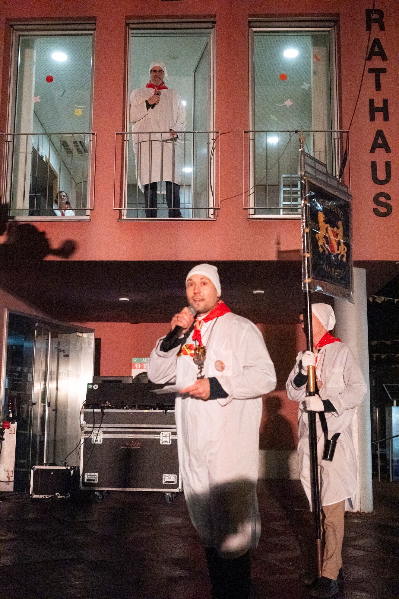 Beim Eintreffen vor dem Rathaus ein ungewohntes Bild: Es war im Rathaus zappenduster. Anfangs kein Bürgermeister weit und breit, kein Bediensteter, der den Narren die Türen oder wenigstens die Fenster hätten öffnen können. Und so skandierten die Narren, allen zuvorderst der Oberzunftmeister, sein Seneschall und ein Fahnenträger, laute Rufe, der Bürgermeister möge sich am Fenster zeigen. Dann kam endlich Leben in die Szenerie. Doch ganz kampflos wollte Jens Fondy-Langela seine Macht und vor allen Dingen den Stadtschlüssel nicht an die Narrenschar übergeben, denn: „Es gibt bei uns doch nichts mehr zu holen, wir sind pleite“, machte der Bürgermeister deutlich. Das schreckte allerdings Oberzunftmeister Anlicker und seine Mannen respektive Frauen nicht ab, das Bürgermeisterzimmer im ersten Obergeschoss über eine Leiter zu entern und dem Burgi den Schlüssel zu entreißen. In ihrer Verkündigung wünschten Oberzunftmeister und Seneschall den Narren eine glückselige Fasnacht, forderten zu guter Stimmung, einem friedlichen Verlauf und viel Spaß auf.