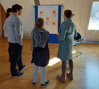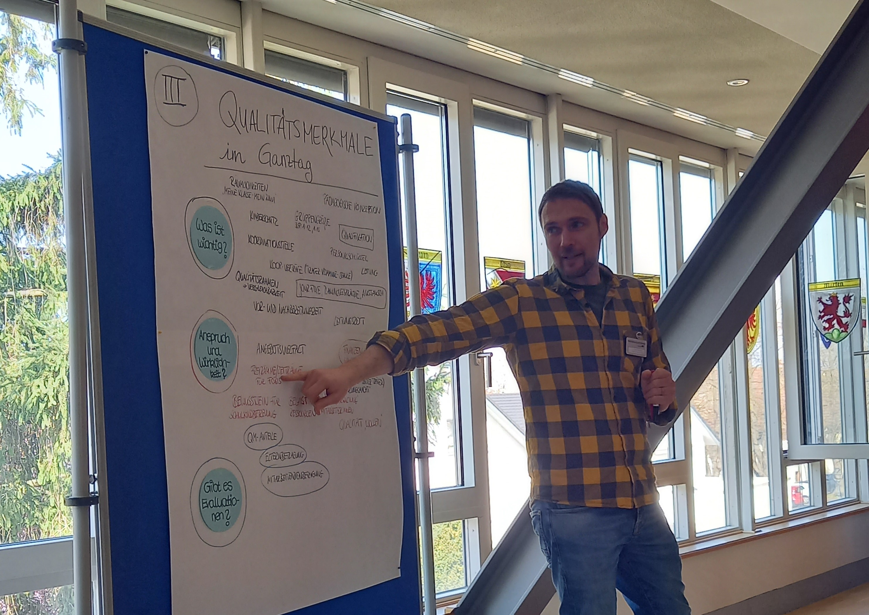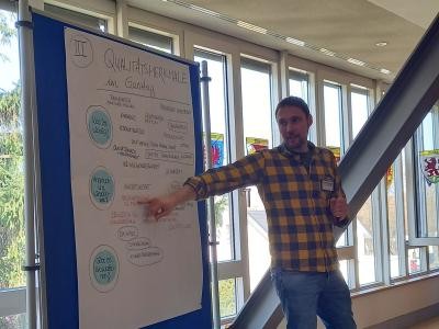 Im Anschluss wurden alle Anwesenden selbst aktiv. An verschiedenen „Marktplatzständen zum Ganztag in der Schule“ mit den Themenschwerpunkten Ferienbetreuung, AG-Angebote, Qualitätsmerkmale und aktuelle Themen konnte man sich in unterschiedlichen Gruppenkonstellationen über die jeweiligen Themen austauschen. Schnell wurde deutlich, dass alle Kommunen mit den gleichen Herausforderungen – personelle, räumliche und finanzielle Ressourcen und Möglichkeiten – zu kämpfen haben. Daraufhin wurden die verschiedenen ausgearbeiteten Marktplatzstände vorgestellt. In einer regen Diskussion tauschten sich die Kommunen und Träger intensiv aus. So konnten Fragen beantwortet und Ideen sowie Anregungen geteilt werden.