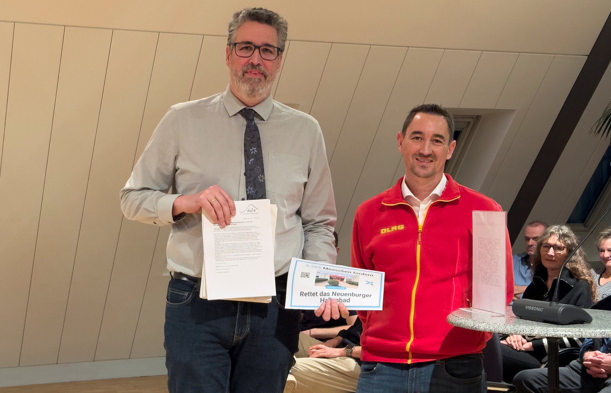 Vor der Übergabe hatte Alexander Schropp von der DLRG-Ortsgruppe Müllheim/Neuenburg nochmals die Wichtigkeit des Hallenbades sowohl für die Ausbildung der Wasserrettung, für die politisch immer wieder geforderte Ausbildung der Schwimmanfänger als auch für den Vereins- und Schulsport unterstrichen. Karlheinz Schlegel, Verantwortlicher und Trainer der Schwimmabteilung des TV Neuenburg und der Schwimmgemeinschaft Badenweiler, Müllheim und Neuenburg fügte später unter Bürgerfragen an, dass es aus seiner Sicht wohl möglich sei, auch ohne „große Lösung“, sondern in kleinen Schritten notwendige Reparaturen und Sanierungen vornehmen zu können. Er forderte, den sogenannten „Begehungsbericht“, der in der Öffentlichkeit oft mit einem Gutachten verwechselt wird, öffentlich zu machen. Der Unterschied zwischen beiden Dokumenten sei, so erklärte es später Bürgermeister Fondy-Langela, dass ein Begehungsbericht nur erste Probleme aufzeige und ein grundsätzliches Handeln notwendig mache. Der erwähnte Begehungsbericht, so der Bürgermeister weiter, sei von einem Statiker verfasst worden und erfülle selbstverständlich nicht die Aussagekraft eines umfangreichen und rechtsverbindlichen Gutachtens zum kompletten Umfang einer Sanierung. Allerdings habe sich die Stadtverwaltung bei anderen Kommunen zum Aufwand und zu den Kosten erkundigt, die in der jüngsten Vergangenheit ihre Hallenbäder – möglichst vergleichbar mit der Neuenburger Einrichtung – saniert hätten. Deshalb gehe die Neuenburger Stadtverwaltung davon aus, dass ein zweistelliger Millionenbetrag für eine Generalsanierung durchaus „eine Hausnummer“ sein könne. „Nageln Sie mich aber jetzt nicht auf eine konkrete Zahl fest, die wir am Ende der Diskussion und einer eingehenden Untersuchung nicht mehr einfangen können“, betonte der Bürgermeister und warnte in dieser Phase der Debatte vor irgendwelchen kursierenden Zahlen. Fondy-Langela brachte in diesem Zusammenhang eine Besichtigung des Hallenbades durch die Nutzer ins Spiel, bei der „auch in die Tiefe der Katakomben des Hallenbades hinabgestiegen und auch dort die Technik betrachtet werden könne.“