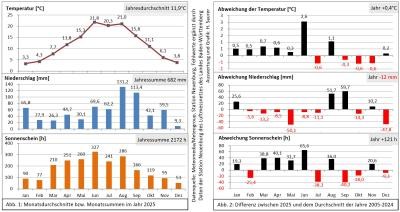Mit einer Jahresdurchschnittstemperatur von 11,9 Grad Celsius und einer Abweichung von +0,4 Grad vom Durchschnitt der vergangenen zwanzig Jahre (2005 bis 2024) ist 2025 ein weiteres Jahr, das einen Teil der Auswirkungen des globalen Klimawandels auf lokaler Ebene zeigt (vgl. Abbildungen 1 und 2 oben). Mit Ausnahme von zwei Jahren (2016 und 2021) haben alle anderen Jahre seit 2014 Temperaturen erreicht, die über dem 20-jährigen Mittel liegen.