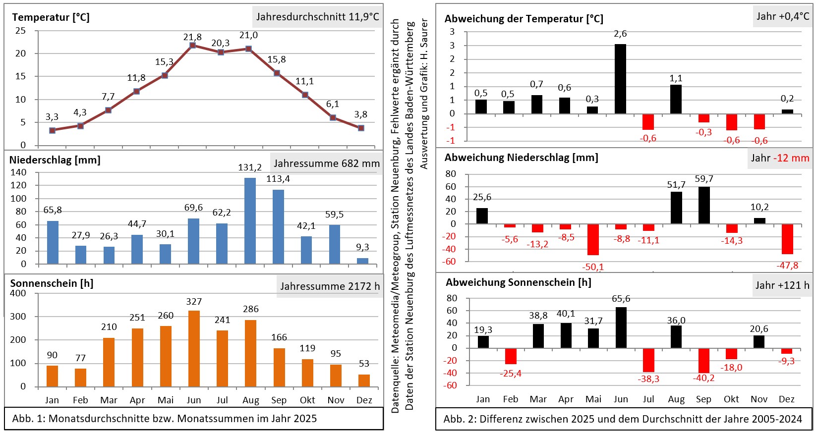 Die Niederschlagssumme des Jahres entspricht nahezu perfekt dem langjährigen Durchschnitt (vgl. Abbildungen 1 und 2, Mitte). Typisch für die Niederschläge ist eine relativ starke Schwankung der Werte der einzelnen Monate. Insofern erscheinen die Niederschläge des Jahres 2025 unauffällig. Geht der Blick jedoch etwas weiter in die Vergangenheit, so wird ein Niederschlagsrückgang in der Region gegenüber den letzten Jahrzehnten des 20. Jahrhunderts deutlich.