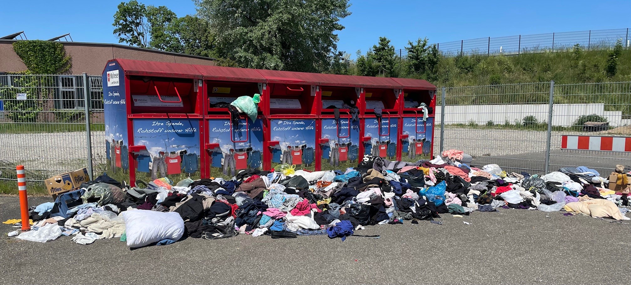 Vor den Altkleidercontainern liegen derzeit dauerhaft Klamottenberge.