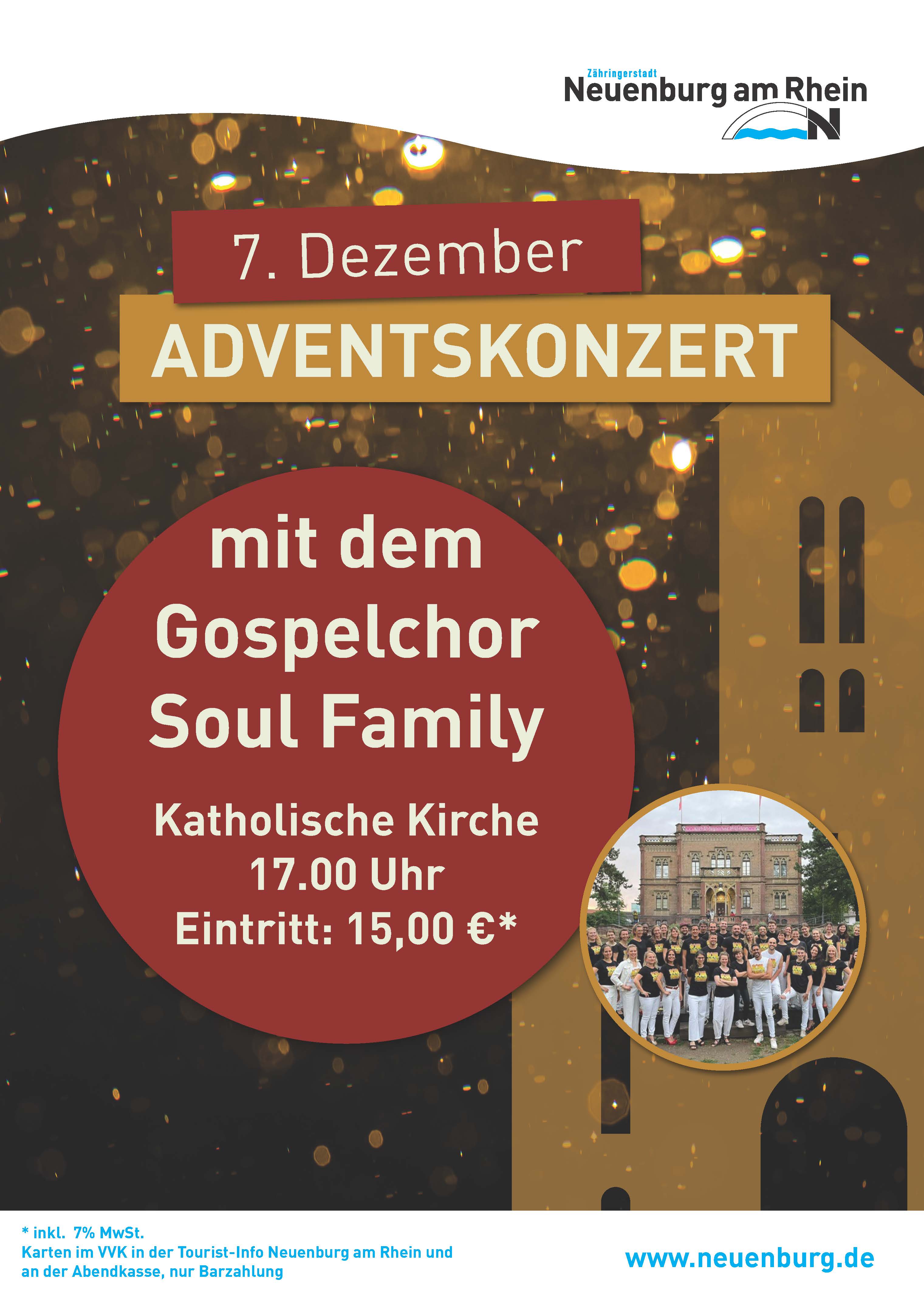 In der stimmungsvollen Atmosphäre der katholischen Kirche lädt die Stadt zum ersten Mal das interkulturelle Vocal-Ensemble Soul Family aus Freiburg am Sonntag, den 7. Dezember, zu seinem traditionellen Adventskonzert ein. Beginn um 17.00 Uhr in der festlich geschmückten katholischen Kirche, die mit ihrer besonderen Atmosphäre den idealen Rahmen für diesen musikalischen Höhepunkt der Vorweihnachtszeit schafft.