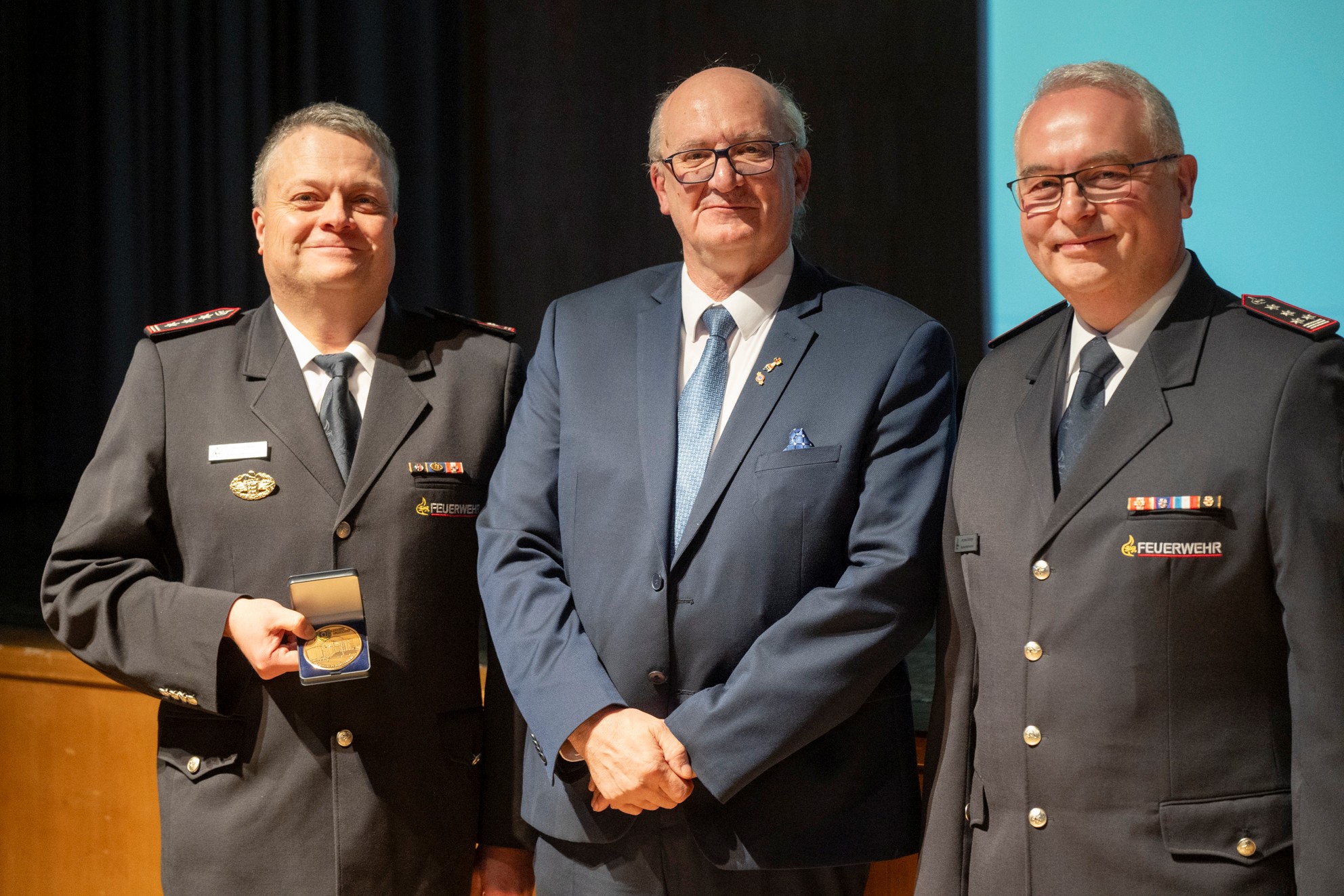 Eine ganz besondere Ehrung wurde der Neuenburger Feuerwehr zuteil. Bantzenheims Bürgermeister Roland Onimus überreichte die Gemeindemedaille seiner Gemeinde und unterstrich mit dieser Auszeichnung die Anerkennung für die hervorragende Zusammenarbeit und dauerhafte Freundschaft. „Mit unserer Zusammenarbeit schlagen wir eine Brücke der Solidarität über die Grenzen hinweg zum Schutz unserer Bürger vor Gefahren“, betonte Onimus und sagte: „Dieses gemeinsame Engagement ist ein Vorbild für Europa.“