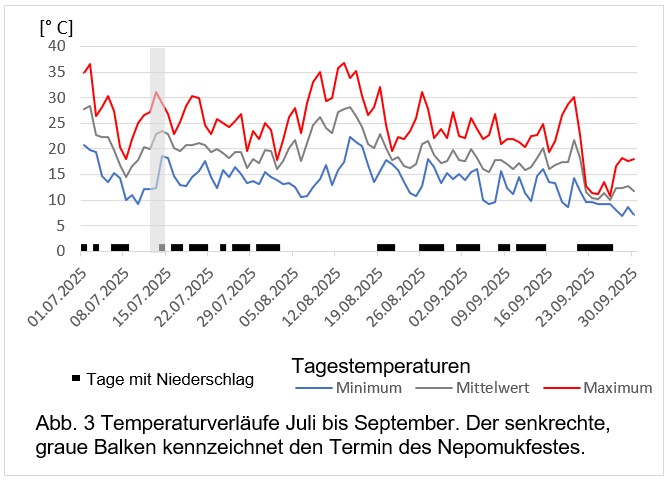 Die Zahl der Sonnenscheinstunden war im abgelaufenen Jahr mit einem Plus von über 120 Stunden üppig. Möglicherweise scheint diese Feststellung nicht mit ihrer eigenen Erinnerung übereinzustimmen. Was sind die möglichen Gründe für eine solche Abweichung der physikalisch gemessenen Werte und der individuellen Erinnerung? Ein Teil der Erklärung dürfte ein gewisses Sonnendefizit in den beiden Ferienmonaten Juli und September sein. Ein weiterer Erklärungsansatz ist, dass der Juli in unseren Breiten normalerweise der wärmste Monat ist. Die Temperaturkurve zeigt jedoch eine Delle der Monatstemperatur im Juli. Juni und August waren im letzten Jahr jeweils wärmer. Aus den Abweichungen der jeweiligen Monatswerte im langjährigen Vergleich (Abbildung 2, oben), lässt sich ableiten, dass die angesprochene „Delle“ in der Temperaturkurve zu einem größeren Teil Folge der deutlich höheren Temperaturen in Juni und August ist als eines kühlen Julis. Werden die Befunde der negativen Abweichungen der Sonnenstunden in Juli und September, sowie die überdurchschnittlich hohen Niederschläge in August und September zusammengefügt, so lässt sich daraus insgesamt ein relativ instabiles Sommer- und Spätsommerwetter erkennen. Schaut man sich die Tageswerte (Abbildung 3) und nicht die Monatswerte an, wird das Ganze noch deutlicher. Der Sommer 2025 begann mit hohen Temperaturen bereits im Juni bis Anfang Juli. Am 2. Juli wurde mit 36,6 °C die zweithöchste Temperatur des Jahres erreicht. Getoppt wurde diese nur von 36.8.°C am 13. August. Nach deutlichem Temperaturrückgang bis zum 9. Juli und mäßigem Anstieg zum zweiten Juliwochenende konnte das Nepomukfest auf dem neuen Festgelände auf der Rheinterrasse bei nahezu perfektem Festwetter durchgeführt werden.