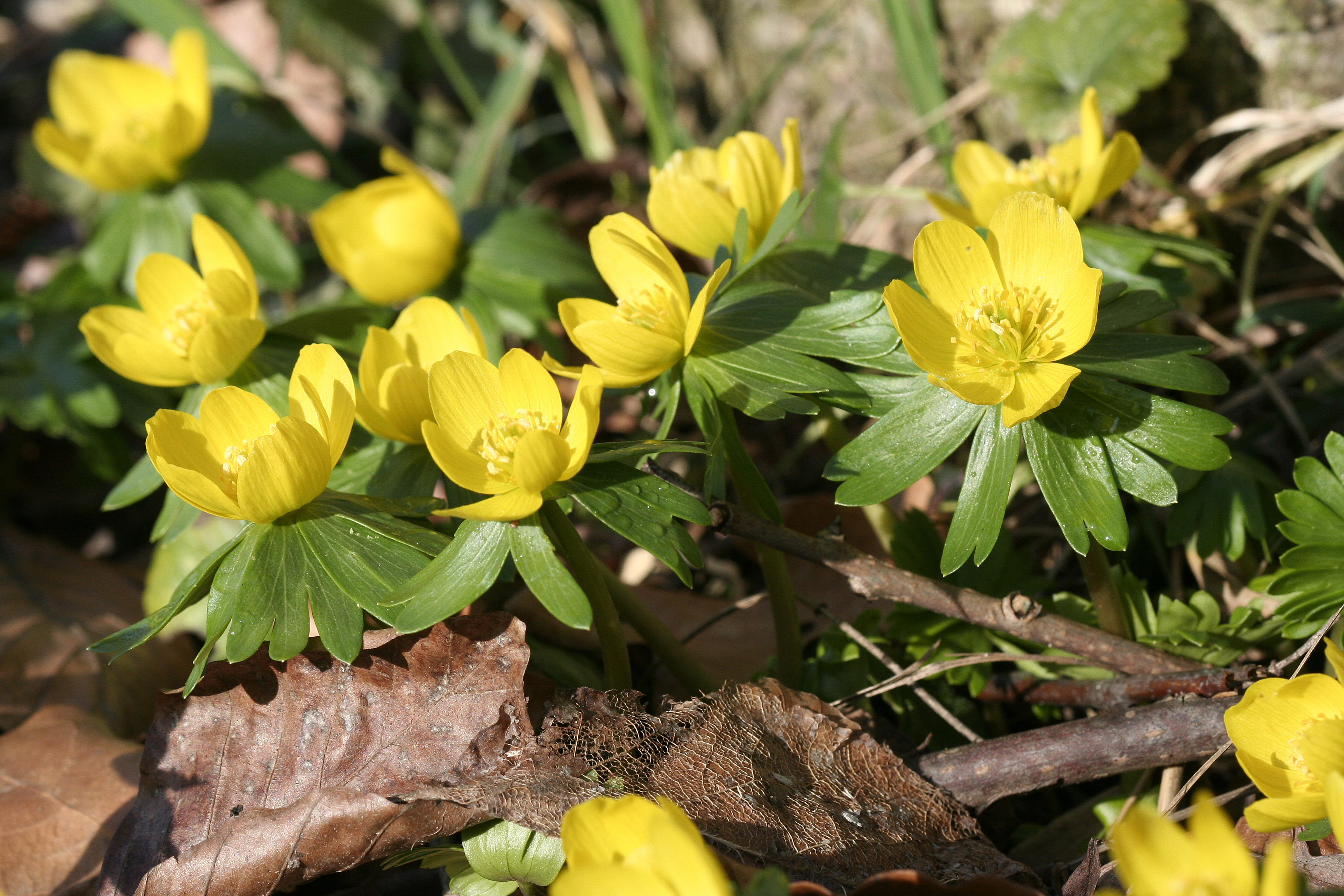 Winterlinge (Eranthis hyemalis) blühen von Januar bis März und gehören damit zu den allerersten Blühpflanzen. Ihre offenen, schalenförmigen gelben Blüten sind gut zugänglich und werden von zahlreichen Wildbienenarten besucht, darunter auch die gut erkennbare Blauschwarze Holzbiene.
