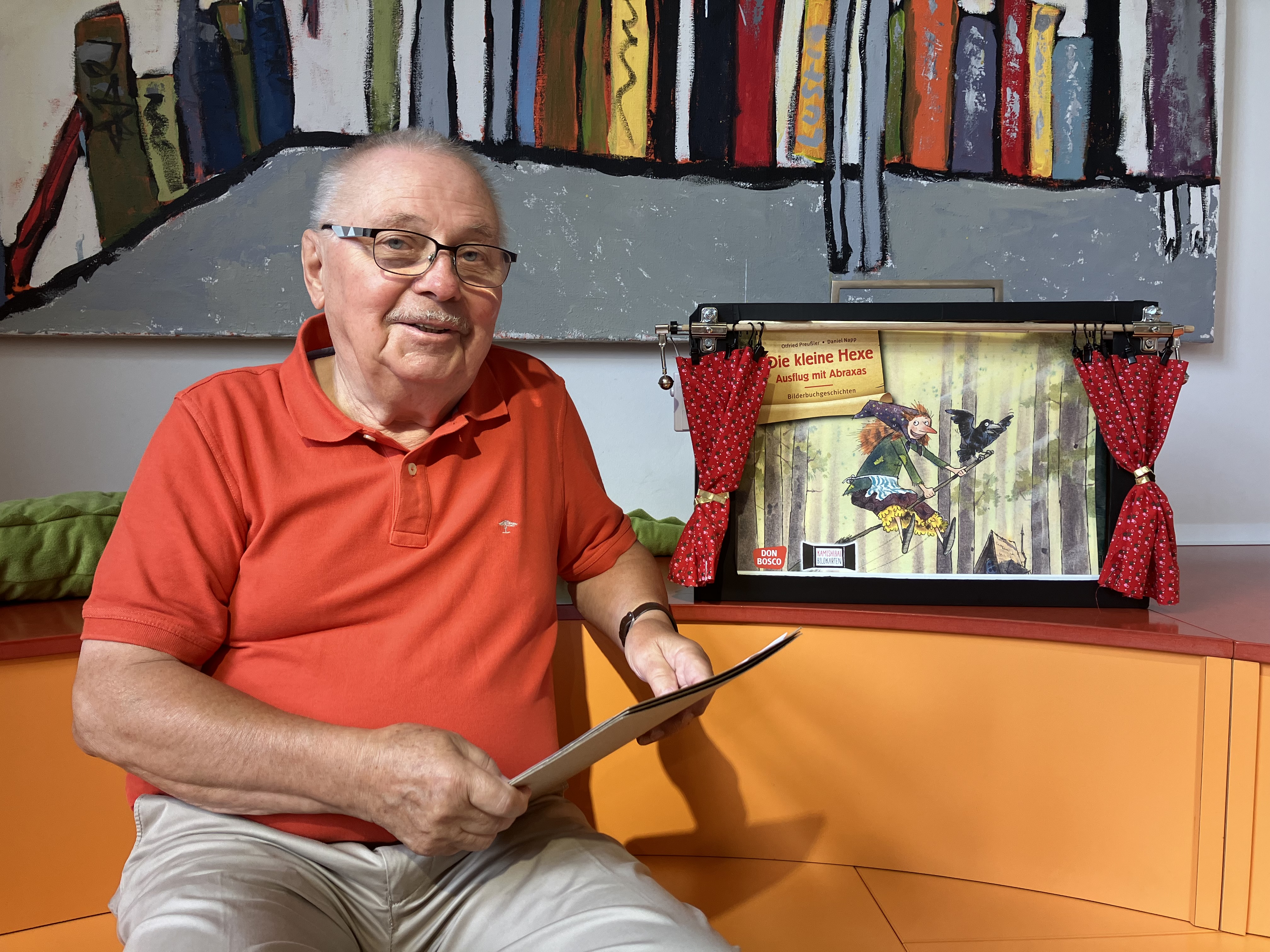 Herr Reimund Kipar, ehrenamtlicher Unterstützer der Stadtbibliothek, hat in liebevoller Handarbeit einen Kamishibai-Theaterrahmen gebaut und wird damit immer am 4. Freitagnachmittag im Monat in der Kinderbibliothek eine von ihm gewählte Geschichte darbieten.