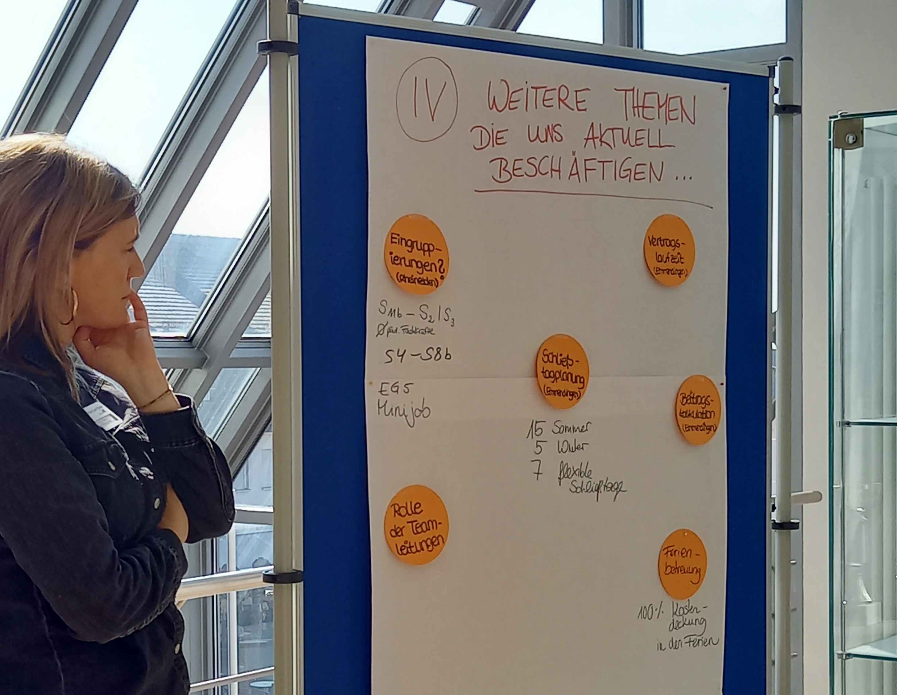 Im Anschluss wurden alle Anwesenden selbst aktiv. An verschiedenen „Marktplatzständen zum Ganztag in der Schule“ mit den Themenschwerpunkten Ferienbetreuung, AG-Angebote, Qualitätsmerkmale und aktuelle Themen konnte man sich in unterschiedlichen Gruppenkonstellationen über die jeweiligen Themen austauschen. Schnell wurde deutlich, dass alle Kommunen mit den gleichen Herausforderungen – personelle, räumliche und finanzielle Ressourcen und Möglichkeiten – zu kämpfen haben. Daraufhin wurden die verschiedenen ausgearbeiteten Marktplatzstände vorgestellt. In einer regen Diskussion tauschten sich die Kommunen und Träger intensiv aus. So konnten Fragen beantwortet und Ideen sowie Anregungen geteilt werden.