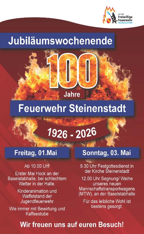 Wir laden Sie herzlich ein, gemeinsam mit uns das 100-jährige Jubiläum der Feuerwehr Steinenstadt zu feiern!